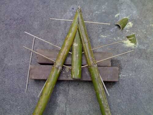 Corte una ranura para el pivote de la barra 2/3 del camino a través del bambú y latigazo de juntos
