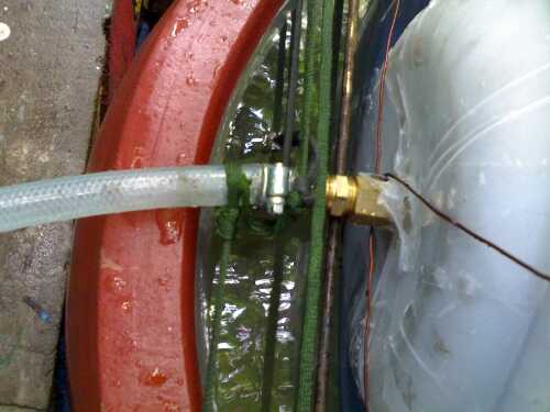 Salida de la bomba era baja como la bomba iba en alta en el agua en alrededor del 25% inmersión para permitir espacio para la unidad y la salida sobre el borde del barril de lluvia, y nos estábamos girando muy lentamente.