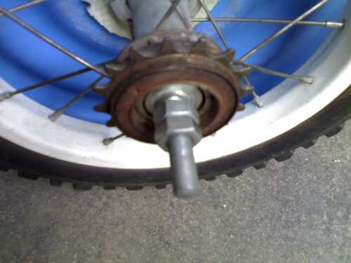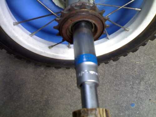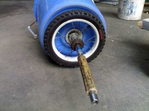 Una vieja llave tubular de bujía equipadas las tuercas del eje de rueda muy bien - llenaron el centro del tubo con el llenador del cuerpo del coche ($2,50) para sostener el eje más allá de las tuercas de centro, encontró entonces una longitud razonable ajuste de bambú para caer sobre el tubo de la llave - también sostenido centrado con el llenador del cuerpo.