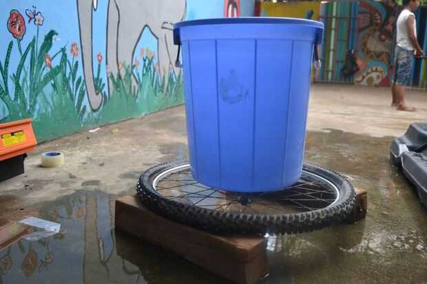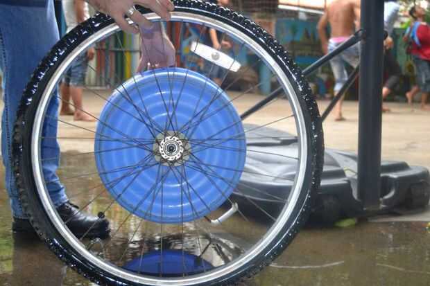 - Todo el conjunto se tambalea de lado a lado cuando gira. El cojín inferior puede estar fuera de posición o no regularmente en forma. El eje de la bicicleta puede ser doblado - reemplazarlo o trate de usar otra rueda de la bici. Su rueda de bicicleta puede ser doblada y causando oscilante en su banco - uso una rueda diferente si te gusta, pero esto no es necesario para el funcionamiento de la bomba.