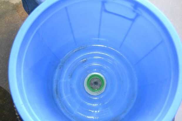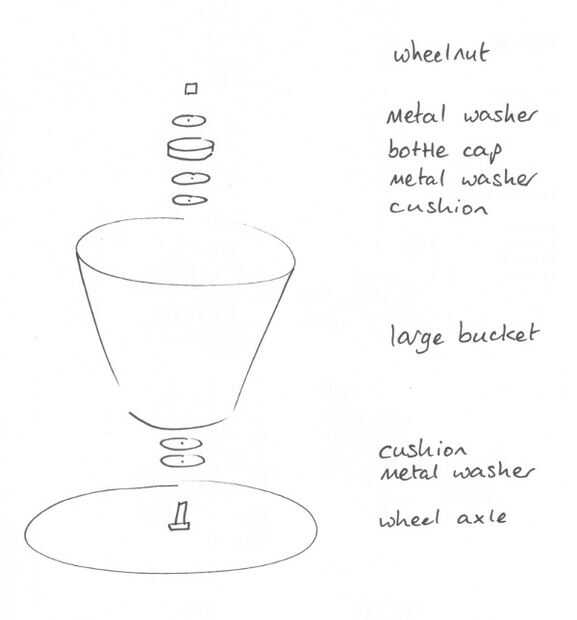 7. sobre el segundo cojín, coloque otra arandela metal grande - idealmente del mismo tamaño como la tapa de la botella de 20 litros o más grande, entonces la tapa de la botella en el eje de la gota. Más tarde, se ser enroscar la botella de 20 litros en la propia tapa dentro de la cubeta...