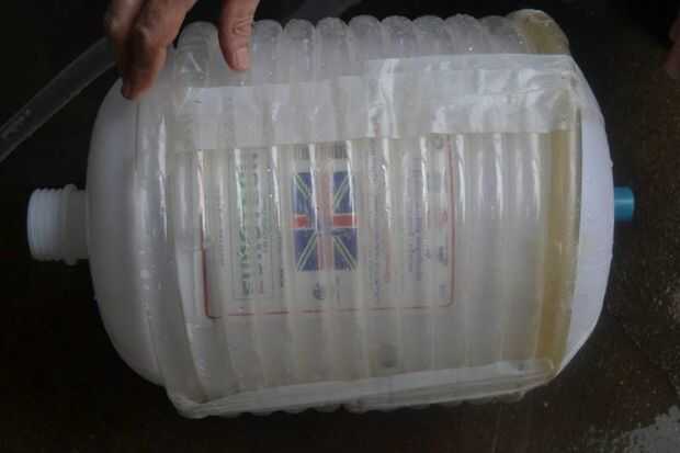 Conecte la manguera reforzada la manguera normal, entonces, usando cinta adhesiva para fijar la manguera a la botella cada par de vueltas comienzan a una espiral creciente alrededor de la botella de la base de la bobina. Enrolle la manguera firmemente pero sin la deformación y con cada vuelta sucesiva tocar la última. Deje de enrollar y asegurar a todos los de la manguera en espiral en su lugar con cinta adhesiva cuando curvatura hacia el cuello de la botella comienza.