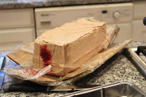 Retirar el helado del congelador y corta el ataúd de cartón para revelar un ladrillo sólido helado. Coloque éste encima de la rebanada de bizcocho relleno de caramelo.