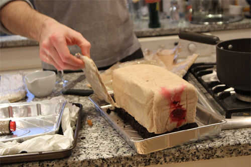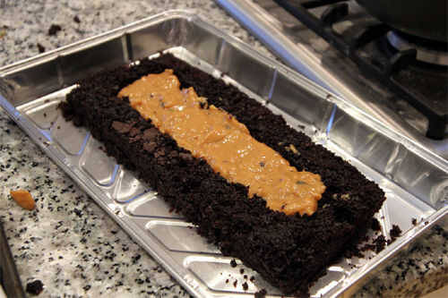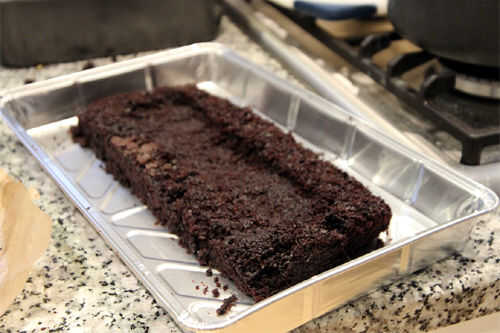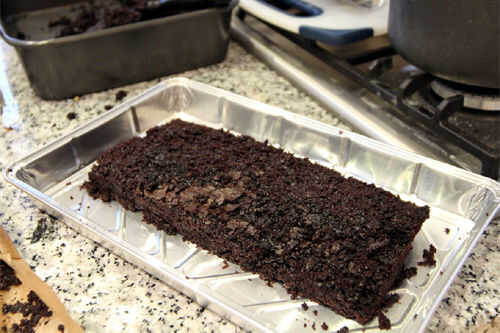 Retire la tarta de chocolate Guinness de su bandeja, si no lo hecho ya y recortar de 25 cm x 10 cm. Si la tapa está desnivelada, use un cuchillo para nivelar. Coloque el pastel cortado en el centro de la bandeja de papel de aluminio sin usar.