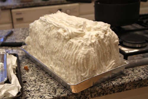 Usando una manga pastelera, cuidadosamente tubo el merengue italiano fresco sobre el pastel de helado, asegurándose de que es totalmente cubiertos (incluyendo el merengue duro, que ya se ha pegado a los lados). No sienten la necesidad de utilizar el merengue; sólo tiene que utilizar bastante para una cobertura consistente 1-2cm.