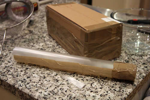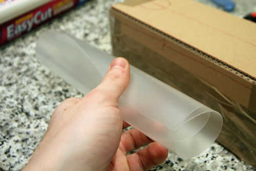 Hacer un molde para tu chocolate enrollando una hoja de plástico flexible en un cilindro de 4cm de diámetro y al menos 27cm de longitud. Con cinta adhesiva el borde libre de la botella para celebrar juntos y cubrir uno de los extremos con film transparente y cinta adhesiva para que no escape.