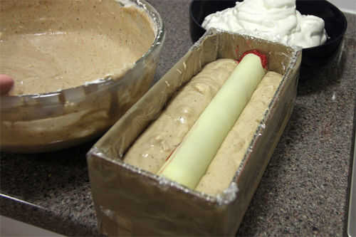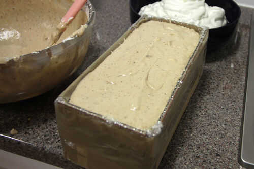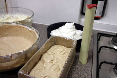 Vierta o cuchara la mezcla en tu molde de cartón forrado de plástico hasta que el molde esté medio lleno. Con cuidado coloque su cilindro de chocolate lleno de sorbete sobre esta cama de helado, luego llene el resto del molde con el helado.