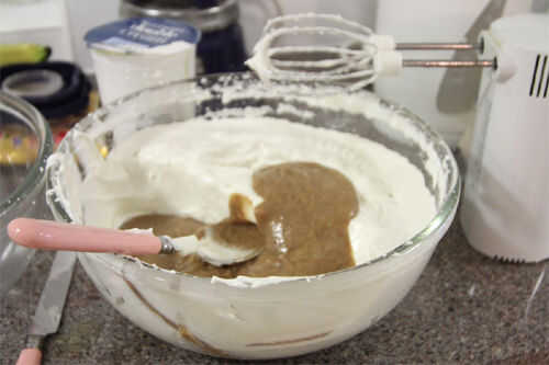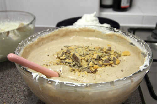 Batir el resto de la nata en un recipiente aparte hasta que esté espesa pero no tanto que se vuelve mantequilla. Doblar la crema en el merengue para completar la mezcla de helado.