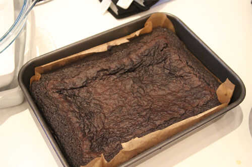 Vierta la mezcla en la bandeja para hornear forrada y hornear en el horno durante al menos 45 minutos. Para comprobar si el pastel está cocido, meter un cuchillo en su centro. Si la hoja sale limpia y seca en lugar húmedo y pegajoso, se acaba.