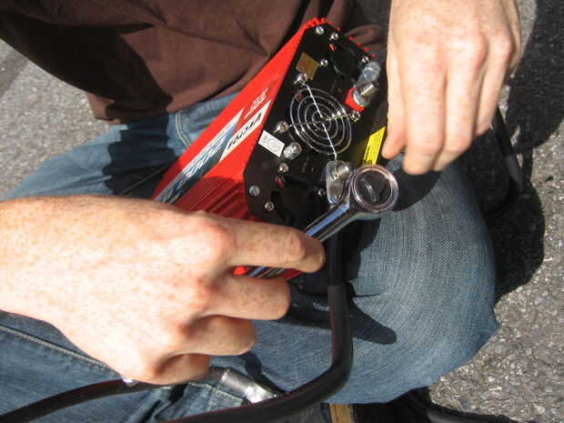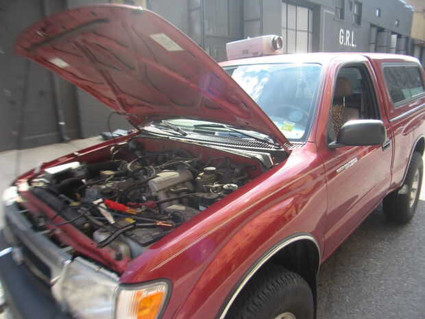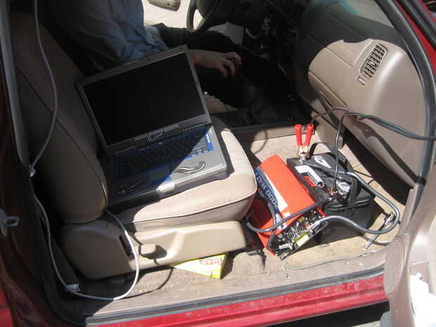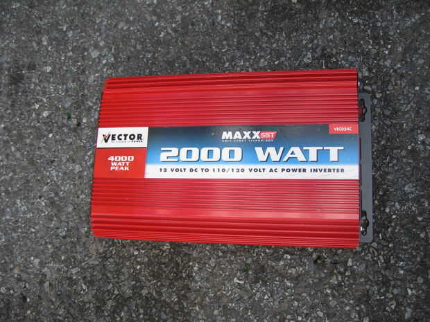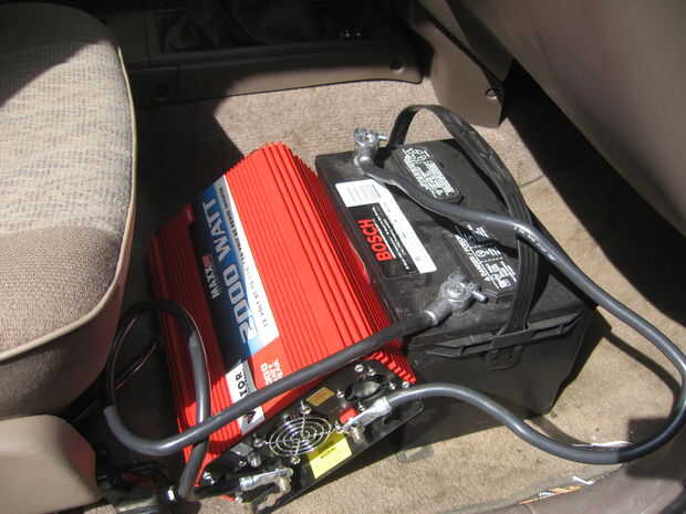 Coloque la batería secundaria en el piso en el asiento del pasajero. Poner el convertidor 2000 vatios en el suelo junto a la batería. Encienda el coche y pop la campana.