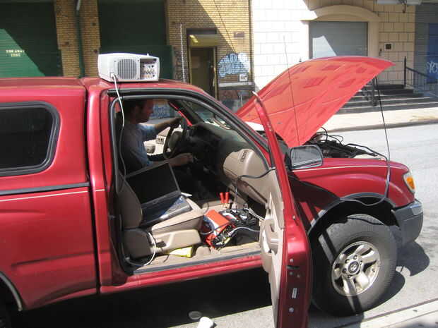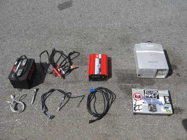 Si tienes acceso a un proyector digital con más de 2500 lúmenes necesita un inversor de corriente alterna más de gran alcance. El sistema que se muestra aquí utiliza un inversor de corriente 2000 Watt AC con un proyector digital de 4000 lumen. Esta es la configuración de la proyección utilizada para el Análisis de Graffitiy las proyecciones por el Graffiti Research Lab.