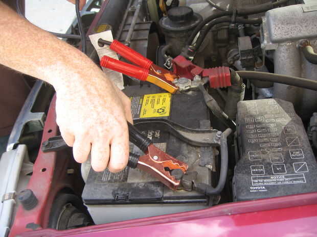 - Conecte la pinza del cable de puente rojo-manejado, positivo al borne positivo de la batería de coches (el uno con el signo más).