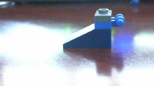 Tomar la pieza azul y poner algo de mango encima. Vuelva a colocar la pieza del perno prisionero solo de eso. Entonces puso ese artilugio en la base. Asegúrese de que la pones en la parte gris oscura en uno de los lados. Y por último añadir una una longitud silla de clavos lejos del frente.