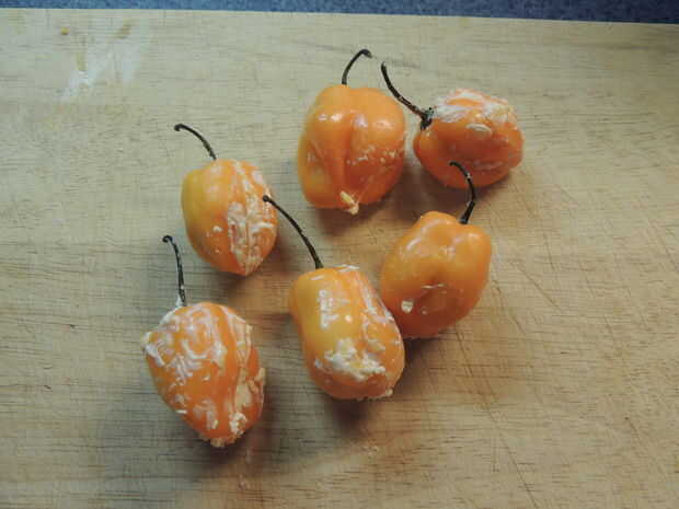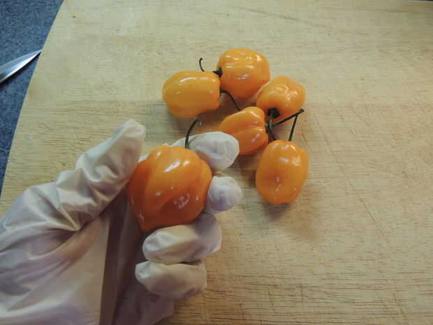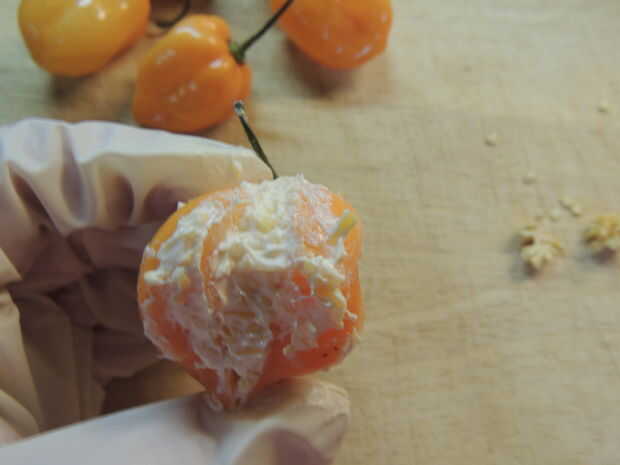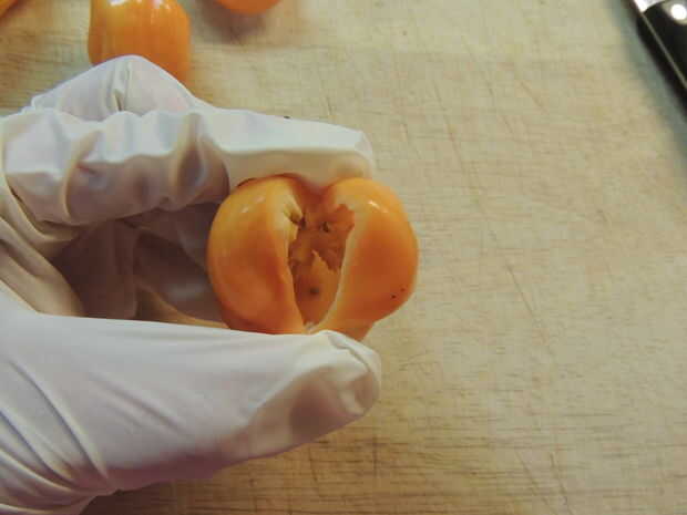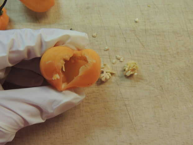 En primer lugar tomar un habanero y hacer un corte en el lado. Cuidadosamente y lentamente apriete la parte superior e inferior para abrir el corte y revelan el interior de la pimienta. Con un pequeño cuchillo afilado, corte con cuidado las semillas de la pimienta. Esto toma un poco de paciencia, pero el resultado merece la pena!