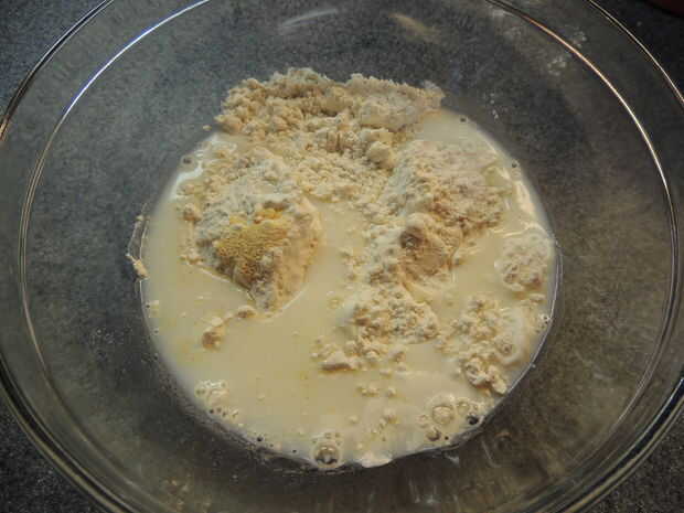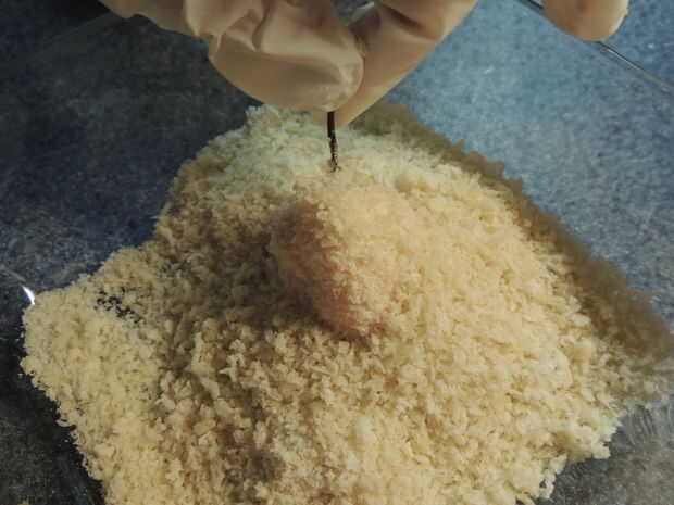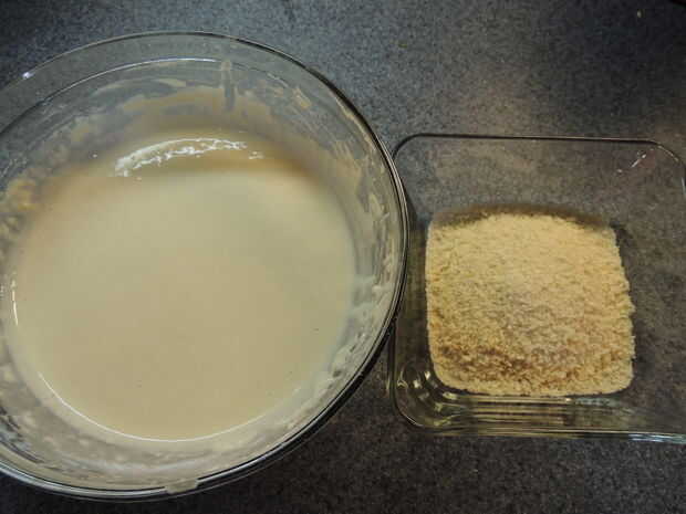 En un recipiente mezclar la harina, leche, sal, ajo y polvo de hornear. Debería parecerse a una masa de panqueque. En otro recipiente, agregar las migas de pan panko y al lado de la masa.