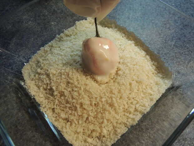 Usando guantes, tomar una pimienta y cuidadosamente dip/roll lo en la mezcla. Desea cubrir totalmente el pimiento, pero no el tallo por lo que parece una mecha una vez terminado. Sacuda el exceso masa y colocar en el pan rallado. Espolvorear el pan rallado por encima y dejarla caer sobre los lados. Que desea mover la pimienta tan poco como sea posible para mantener la masa y empanada en lugar. Una vez cubierto completamente, suavemente sacuda el exceso de empanado y reservar para rebozar el resto de los pimientos.