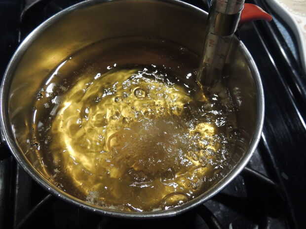 Puede utilizar una freidora o una sartén pequeña. Vuelta de su freidora a 350 grados F o llenar una cacerola pequeña la mitad con aceite y el calor a 350 grados F controlando con un termómetro de caramelo. Una vez que el aceite esté caliente, lentamente deje caer unos cuantos habaneros en el aceite y cocinar durante unos 3 minutos hasta que estén doradas. Quitar con pinzas y reposar sobre papel de cocina durante 5 minutos.
