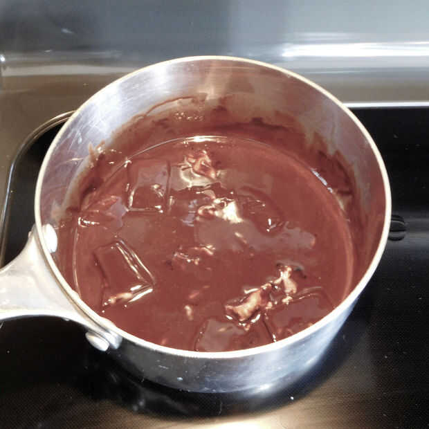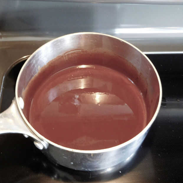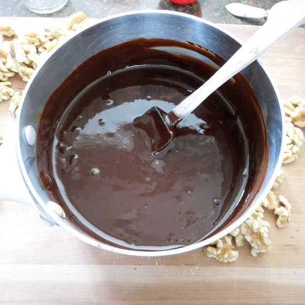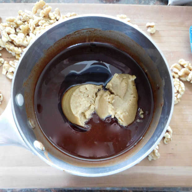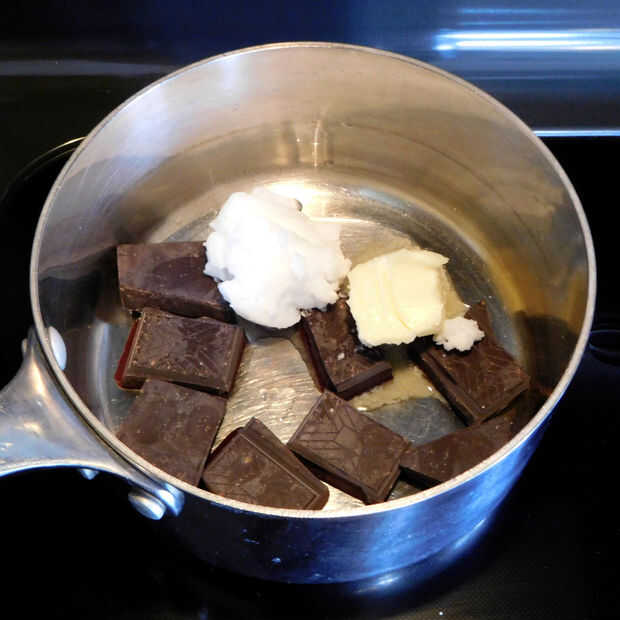 En una cacerola mediana a fuego medio derretir chocolate, mantequilla y aceite de coco hasta que esté suave. Retirar del fuego y agregue el extracto de vainilla y mantequilla de nuez, asegurándose de que no hay grumos.