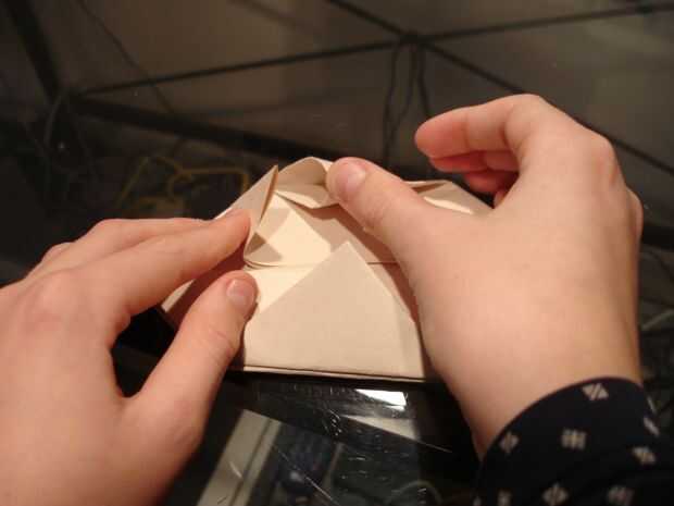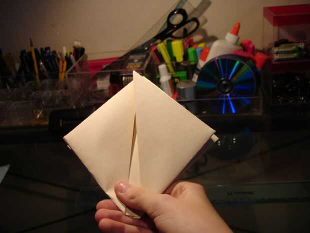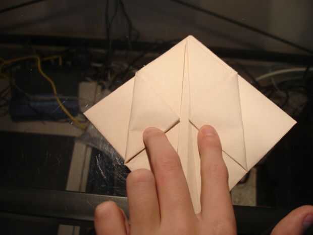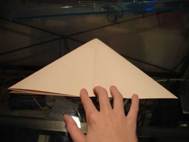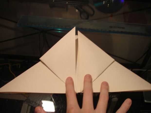 1. ahora tome su triángulo y doble tanto de las aletas hacia el medio como se ve en la foto.