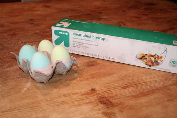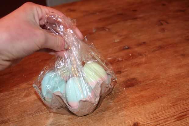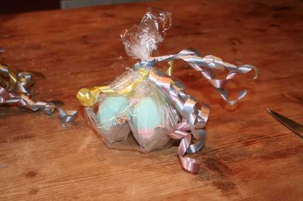 Para estas bombas especiales de eggstra, empaquetan por cortar un cartón de huevos. Luego, envuelto en plástico y había atado de alguna cinta que se encrespa en la parte superior. Hierba de la cesta de Pascua también hace un gran acento.
