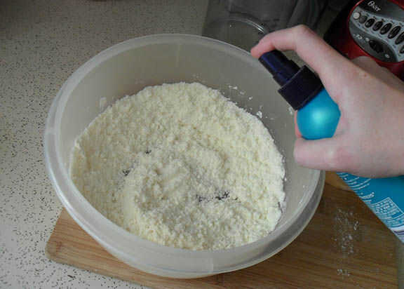 Llenar su botella de spray con agua. Es importante que elijas una botella del aerosol que se de la niebla, rociar una distribución uniforme y ligera de agua sobre sus ingredientes. NO quieres una botella que arroja a chorros o los jets, ya que esto sólo activará una pequeña área y posiblemente conseguir la mezcla demasiado mojada. Utilicé una antigua botella de spray de pelo e hizo unos test arroja a chorros en el fregadero para asegurar que todo el producto antiguo estaba fuera del sistema.