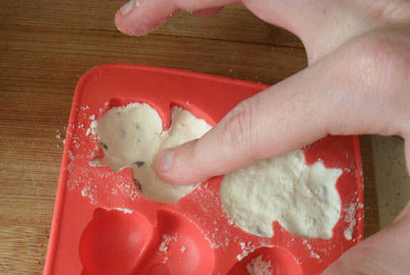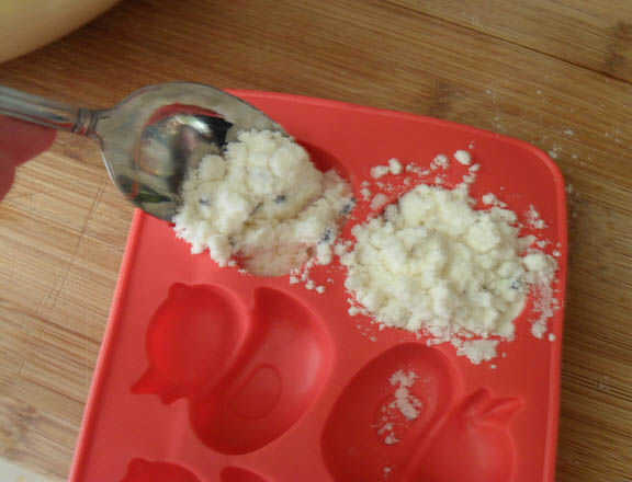 Presione la mezcla en moldes de sus. Si usted tiene una forma especial, como mis patitos de goma aquí puede llenar el molde la mitad cierto, pulse, luego llenar el resto y pulse otra vez.