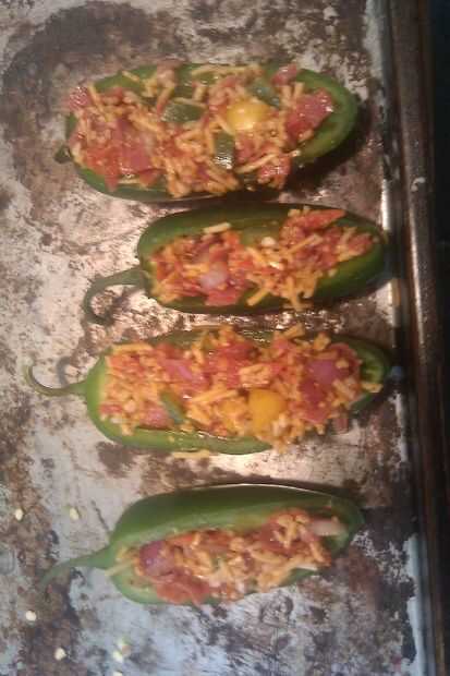 • Llene la mezcla en los jalapeños ahuecados hacia fuera, cuidando de no rasgar. Les cosas tan completo como sea posible.