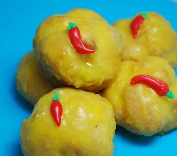 Estos soplos de crema Chile-realzado, relleno de crema de plátano, cubierto de glaseado de mango son un postre perfecto para tu próxima comida al aire libre de verano o vagamente auténtico luau.