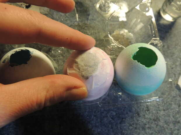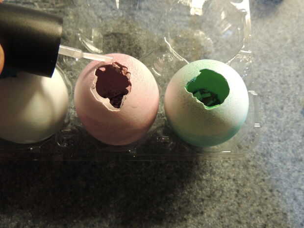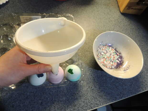 Coloque los huevos en un envase de huevo vacío para mantenerlos en posición vertical. Usando el embudo (o papel enrollado en forma de embudo), relleno de cada huevo con 1 2Tbs de confeti/brillo. No es necesario llenarlos completamente, pero se puede si quieres una explosión enorme ! ADVERTENCIA: llenar todo el camino es un desastre enorme . ¡ Pero! Cuanto mayor sea el desorden, el más divertido, justo?? Jejeje. A continuación, cortar círculos pequeños del filtro de café sólo lo suficientemente grande como para cubrir la abertura en el huevo. Aplique una fina capa de esmalte de uñas alrededor de la abertura y deje obtener pegajoso durante unos 30 segundos. Coloque el filtro sobre la abertura y presione los bordes para sellar. Dejarlo seco durante 5 minutos y tu listo para obtener craqueo! (valga la redundancia!) Si usas pegamento, tarda más tiempo en secarse (12 horas). Lea las instrucciones en el paquete de cola para más detalles. He usado esmalte de uñas capa superior clara de secado instantáneo porque permite ser real, los padres no tienen un montón de tiempo y no hay nada peor que esperar cola secar! La mina seca muy rápido! Puntuación de Super!