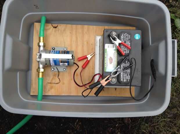 Cortar el resto de la madera contrachapada de 12 "x 17 1/4" para utilizar como base para la Asamblea. Marque la ubicación de la batería en un extremo de la madera contrachapada, de aproximadamente 2 pulgadas en el extremo. Marque la ubicación de la bomba en el otro extremo de la madera contrachapada con los terminales hacia la batería y las conexiones de manguera en el otro extremo.