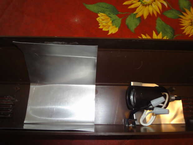 Aquí tienes que utilizar pegamento caliente para pegar la lámpara en. Asegúrese de que es la distancia correcta de la chapa para que la luz se refleja en él. También, usar algo al espacio hasta que al insertar la luz, que no está tocando la chapa o el acuario sí mismo. Utilicé un trozo de metal para él.