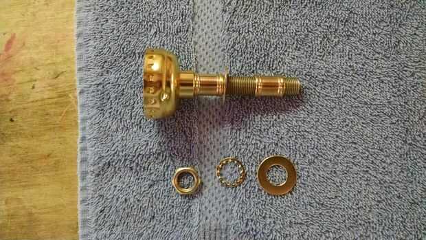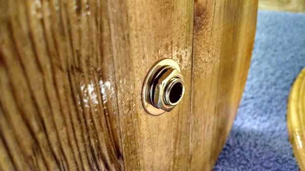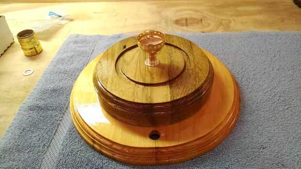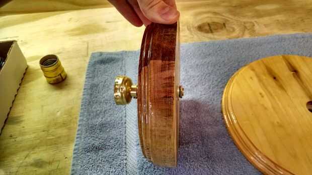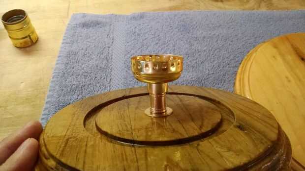 Después de su base de madera de la capa, puede añadir la toma de corriente. Mirando la primera foto, puedes ver que he utilizado un segundo acoplamiento para conectar un segundo pezón más pequeño. También usé un acoplador para ampliar la toma sobre la base simplemente porque me gustó el aspecto del latón acoplamiento con el casquillo de latón. La toma fue asegurada luego utilizando la tuerca hexagonal y arandela como se muestra en la tercera foto.