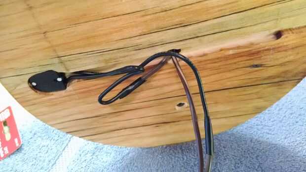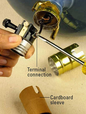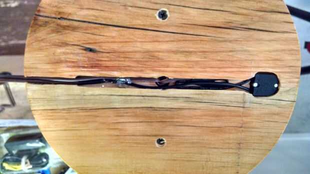Asegure el interruptor en su lugar (mina fue ajustada y no necesaria adhesivo). Enrosque el cable de la lámpara de reemplazo por el agujero central y fije cada lado con un tornillo en el casquillo de la bombilla. También hice un underwriters nudo antes de colocar las dos partes de la toma de juntas. A continuación fije el interruptor al cable de recambio. Me corte un lado de la cuerda de repuesto y había añadido el interruptor en el lugar de donde cortar. Cuando todo está conectado, ponen muy bien en la ranura enrutada y bloquear los cables con una pistola de pegamento caliente.