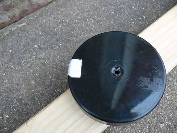 En segundo lugar, darle la vuelta y presione contra un poco de madera para pasar por ella. Marcar el círculo en este lado también, sigue siendo suave. Mantener, y en cierto momento se romperá el plástico dentro del círculo, con un agujero del tamaño correcto.