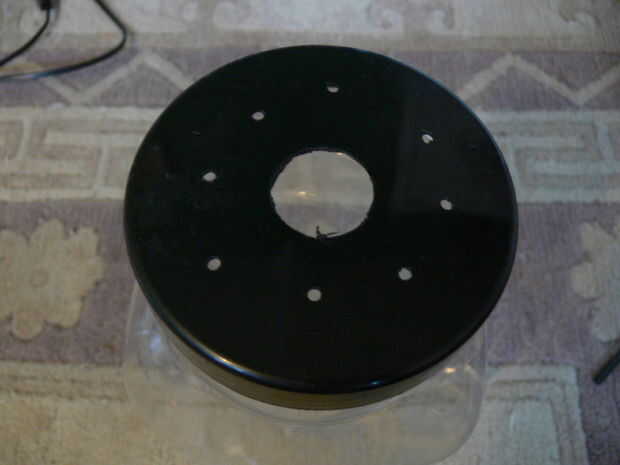 Incluso con una bombilla de ahorro de energía, la lámpara sigue generando calor un poco. Prefiero estar en el lado seguro, tan taladre unos orificios de ventilación superior e inferior de la jarra.