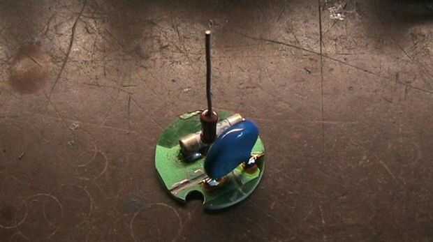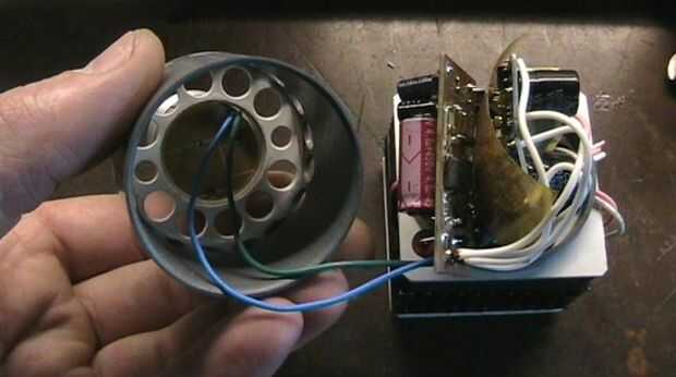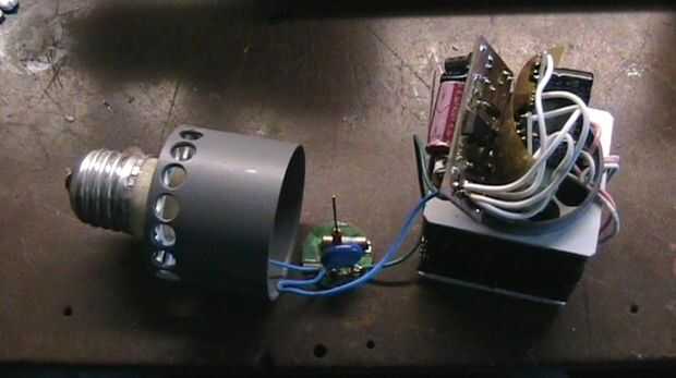 Fuente de alimentación del refrigerador un par de conductores del LED incluido junto con varias vueltas de hilo de rosca grueso y colocado en cáscara del bulbo - un trozo de tubo de alcantarillado de 25... 30 mm de altura. Un pedazo de aislante se puso entre ellos para evitar shortings. Unidades electrónicas no aseguradas en la cáscara especialmente, dimensiones del paquete ajuste sección de la cavidad interior de la cáscara de la bombilla firmemente.
