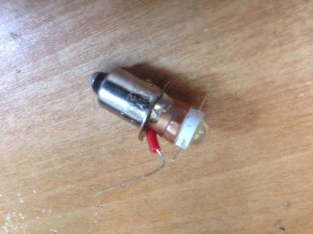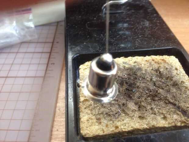 b) usé la espuma en mi base de soldadura para mantener en su lugar. Luego, soldar el alambre de la resistencia en la parte inferior del bulbo. Cortar el resto de la felpa de plomo de resistencia en la parte inferior del bulbo.