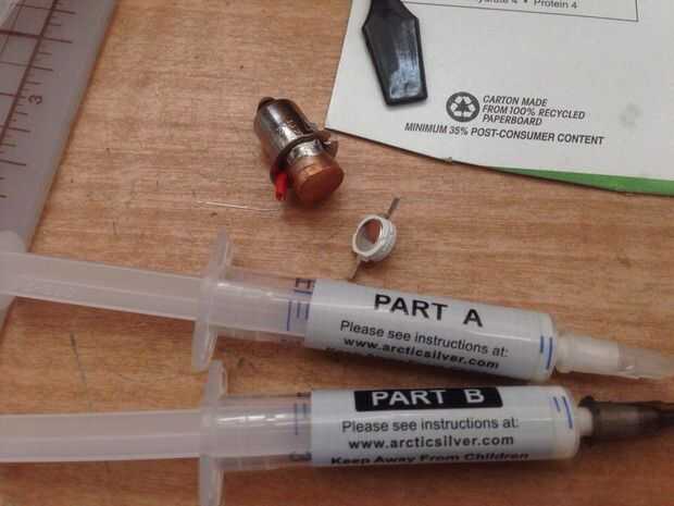 c) si se utiliza una abrazadera y del espaciador plástico, este es el momento para comprobar si cabe el bulbo y el emisor. Limpie con alcohol, tanto la parte superior del disipador térmico y la parte inferior del emisor del grano. a continuación, déjelo secar. Mezclar un poco del epoxi plata Ártico. A sólo un punto de cada parte A y B. Conecte el emisor asegurándose que el lado positivo hacia el lado positivo con el aislamiento. Deje que se seque durante la noche.