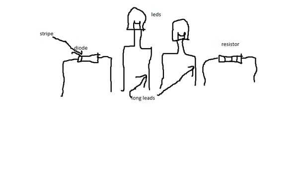 Ahora que el disclamers, primero puse mis piezas en orden. Resistencia, led, led, diodo. Compruebe la polaridad. el diodo sólo va a dejar que el flujo de corriente en una dirección (sorta como d/c). Configurar mi tablero para utilizar 120v aire acondicionado con una desconexión. sus piezas en este orden, resistencia, Diodo led, led, del tablero, la raya el diodo va a ser en el exterior del circuito. Comprobar la polaridad. Energice el circuito y el LED deberá encenderse. NO TOQUE MIENTRAS ENERGIZADOS. Si el LED no se enciende hasta desconectar la alimentación y vuelta tus leds.