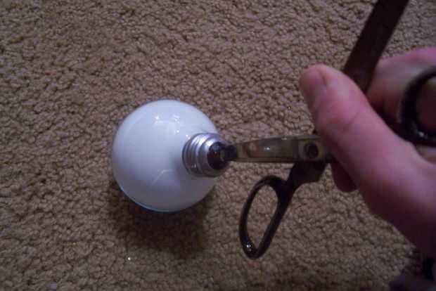 En el extremo de la bombilla, hay vidrio negro. La mejor manera de conseguirlo, es poner el destornillador o tijera flaco en la sangría pequeña donde el conector cobre utilizado, y gire hacia adelante y hacia atrás para romper el vidrio. Ten cuidado, los fragmentos de cristal son extremadamente agudo y extremadamente doloroso una vez que se alojan en las manos.