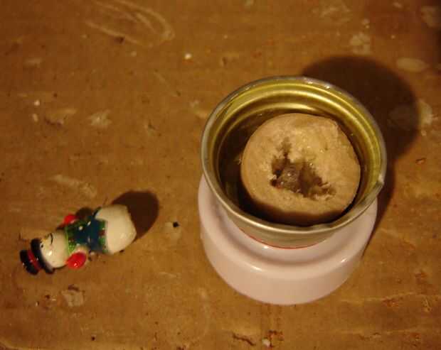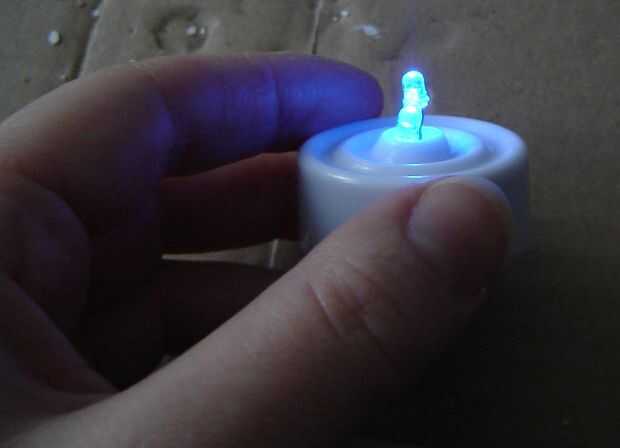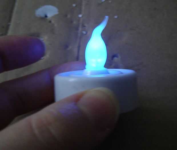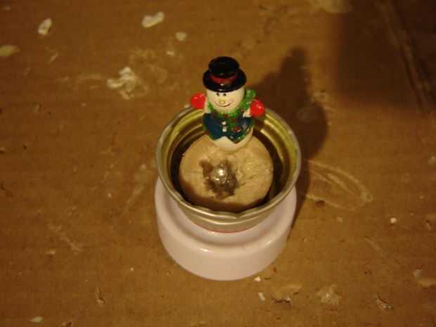 que utiliza una bombilla más pequeña para esta bola de nieve, los utilizados en los refrigeradores. Tuve la suerte de encontrar una vela led azul en un almacén del dólar, que pensé que se vería bien en una escena de nieve.