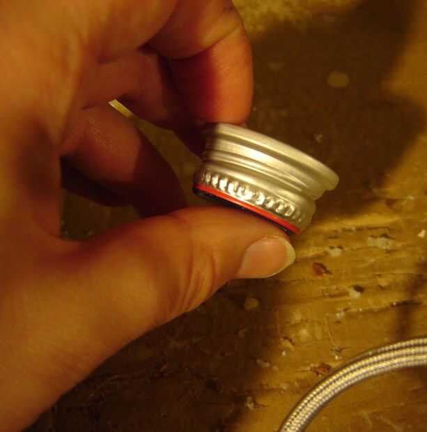 • Luego pegar el corcho en la tapa de la botella. Asegúrese de que el cuello de la bombilla de luz encaja todavía en la tapa.