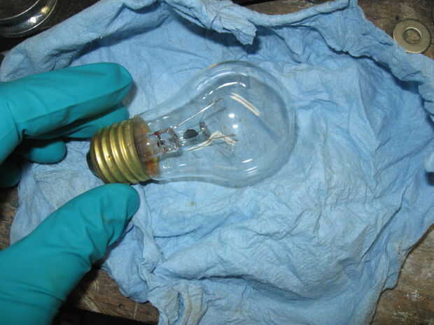 Envuelva el bulbo con una toalla de papel y golpee suavemente con un martillo. Aumentar la fuerza hasta que se rompa de la bombilla. Si el filamento se rompe, comienzan otra vez.