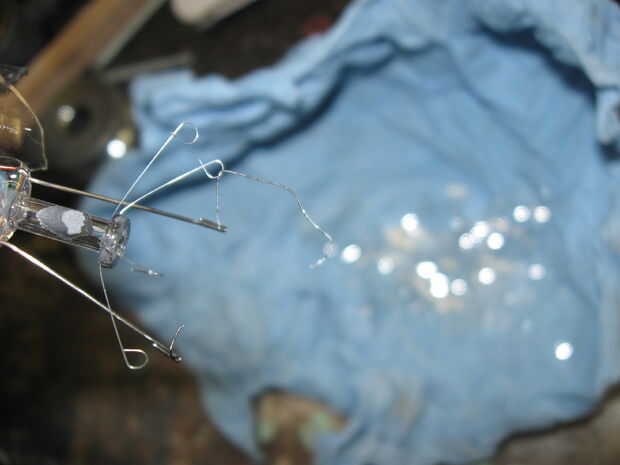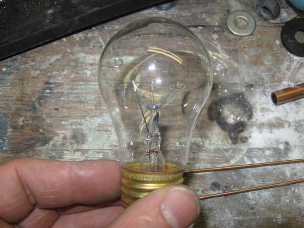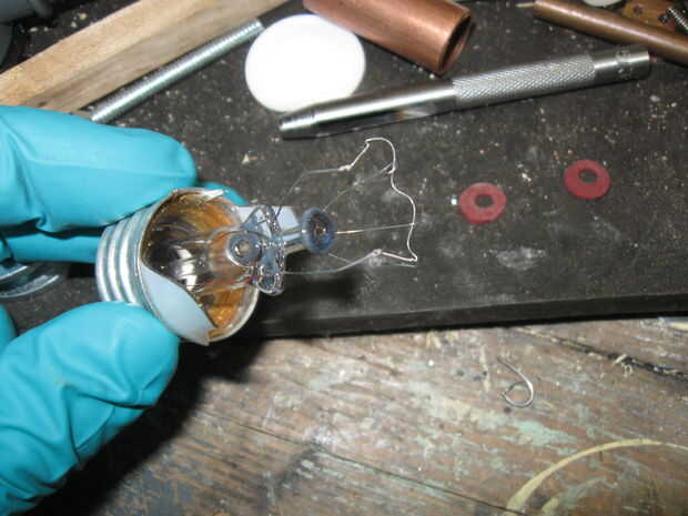 Recortar todos los puntos de conexión hasta que el filamento es libre y apoyado por 2 tramos de alambre de la bombilla.