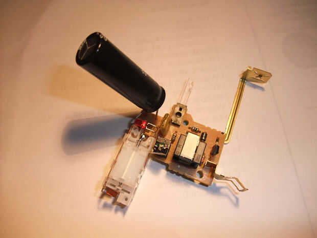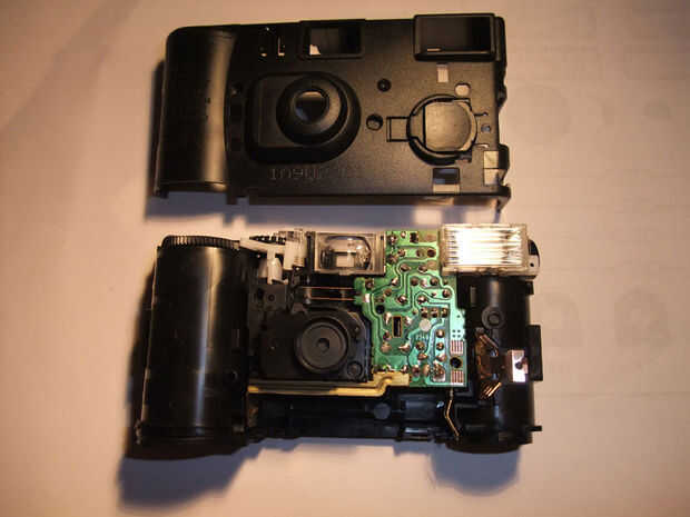 Quitar o perder las aletas de plástico en cada lado y abrir la cámara. Ahora usted puede sacar el módulo flashligt. Atención!!!!!! El condensador se carga a menudo. Si toca el tablero con los dedos en el lugar equivocado tienes un golpe.