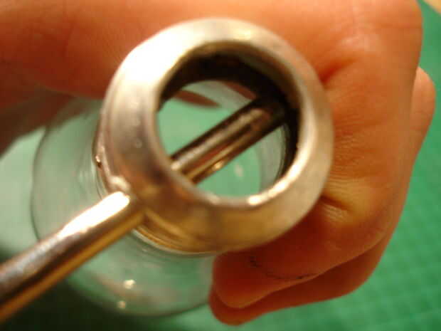 Utilice una broca de taladro o una dremel pulido poco. Asegúrese de que el agujero es lo suficientemente grande como para permitir su caña ir a través de él.