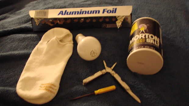 1 calcetín 1 foco de luz 1 par de aguja plyers de nariz 1 cuchillo (no corte youreself!) 1/4 cup'o sal suma hoja de lata... destornillador un montón de arena, azúcar o sal 1 pote de 1 flor colorante de alimento, frutas o shirt(s).