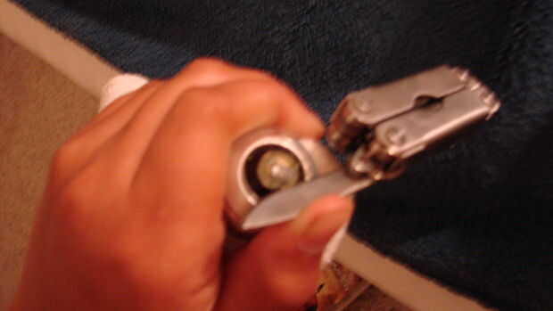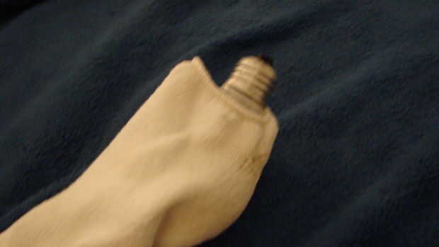 quitar el poco fino cosita (mostrado abajo) consiguiendo que el cuchillo bajo el 1 extremo y utilizar los plyers para llevarlo a cabo (Asegúrese de que la bombilla está en el calcetín en todo momento!)