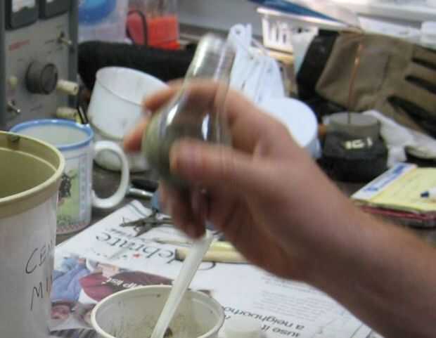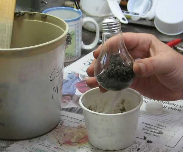 Poner su foco en una pequeña bañera de plástico con el agujero hacia arriba. Cuando se va a agregar la mezcla siempre hay derrames y no desea todo su área de trabajo. Pongo un poco de arena en la parte inferior por lo que permanecerá recto desde el principio una vez que se agrega que unas cucharadas del mortero mezclan está parado recto por su propia.