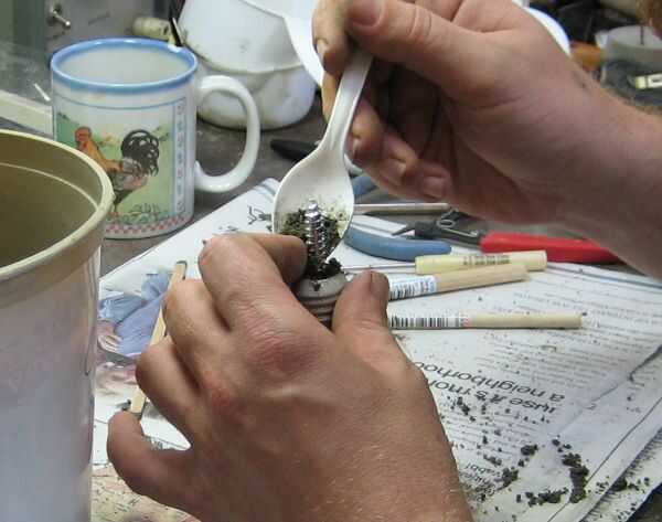 Tomar "prestado" un agitador del café de Starbucks y utilice para golpear ligeramente la mezcla de mortero. Desea seguir agregando la mezcla, apisonar y llenar, apisonar y llenar. Finalmente el bulbo entero es hecho y es prensado en la parte superior. Desea que la mezcla de mortero a nivel con la parte superior del agujero pero no sobresalen en un bulto.
